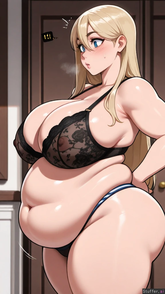 (nyantcha:1.2), (krekkov:1.4), (reiq:1.1), (kittew:1.2), 8k, high resolution, maximum pixel density, masterpiece, (((highly detailed))), ((flawless)), (((high rating))), ((highly detailed face)), full resolution, 8k, high resolution, best quality, detailed eyes, Appearance: Long straight blonde hair with light blue stripes, beautiful wide expressive big sparkling blue eyes, starry pupils, tan skin, freckles, blushing heavily, mischievous eyes, (horny), anime-woman, shocked expression, embarrassed, (erect nipples), tall, (love handles) Outfit: (breasts too big for black lace bra), thong, exposed cleavage, underboob, exposed nipples, Location: Standing, at home, side-view, looking down at self, lounging, Modifiers: (Slim body:1.15), (enormous heavy breasts:1.25), (fat figure:1.45), (fat bubble butt:1.08), (morbidly obese ssbbw:1.25), (fat heavy belly:1.25), (plump face:1.2), (puffy arms:1.2)