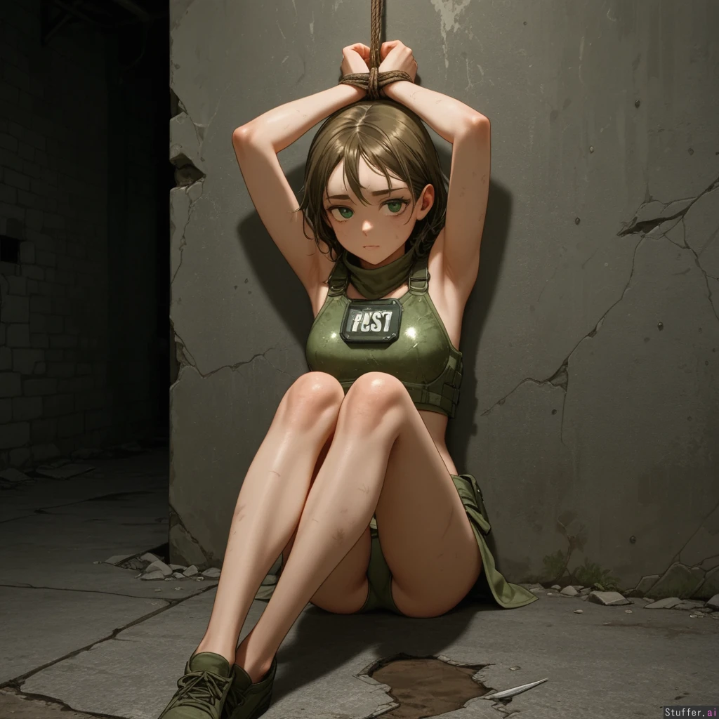 (solo skinny girl), (brown dirty hair, green_eyes), (dungeon), (sitting on floor, back against the wall), (arms tied above the head), (straight legs together), (raider outfit, armor), post-apocalypse, (front_view)