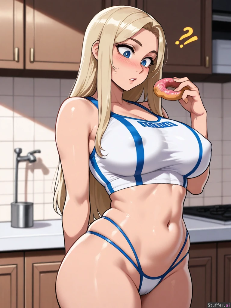 (nyantcha:1.2), (krekkov:1.4), (reiq:1.1), (kittew:1.2), 8k, high resolution, maximum pixel density, masterpiece, (((highly detailed))), ((flawless)), (((high rating))), ((highly detailed face)), full resolution, 8k, high resolution, best quality, detailed eyes, Appearance: Long straight blonde hair with light blue stripes, beautiful wide expressive big sparkling blue eyes, starry pupils, tan skin, freckles, blushing heavily, mischievous eyes, horny, anime-woman, shocked expression, embarrassed, (erect nipples), tall Outfit: tight crop top, thong, Location: Standing, in kitchen, donut in hand, side-view, looking down at self, lounging, Modifiers: (Slim body:1.65), (enormous heavy breasts:0.89), (morbidly obese ssbbw:1.0), (fat heavy belly:1.0),
