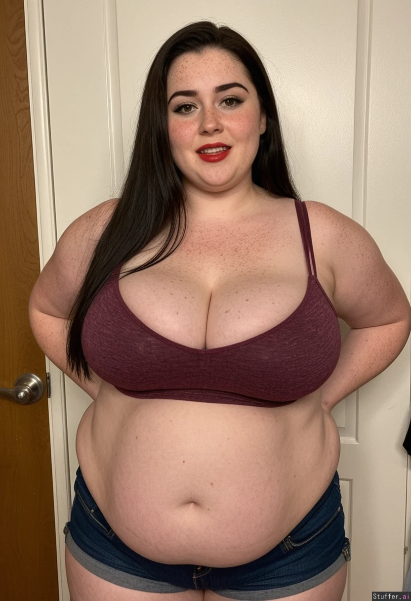 1 girl, fair_skin, (long hair, dark_hair, perfect hair), 32 year old, (Perfect lighting) ((Extremely curvy, chubby belly)) full_body, tight tank top, tight denim shorts ((dark brown_eyes, blushing, light_freckles, red lipstick, eyeliner, eyeshadow, teeth slighly visible, ashamed)), Dressing room , rubbing belly ((Wide_shoulders, very_wide_hips, cleavage, plump_thick_thighs)) red nails,