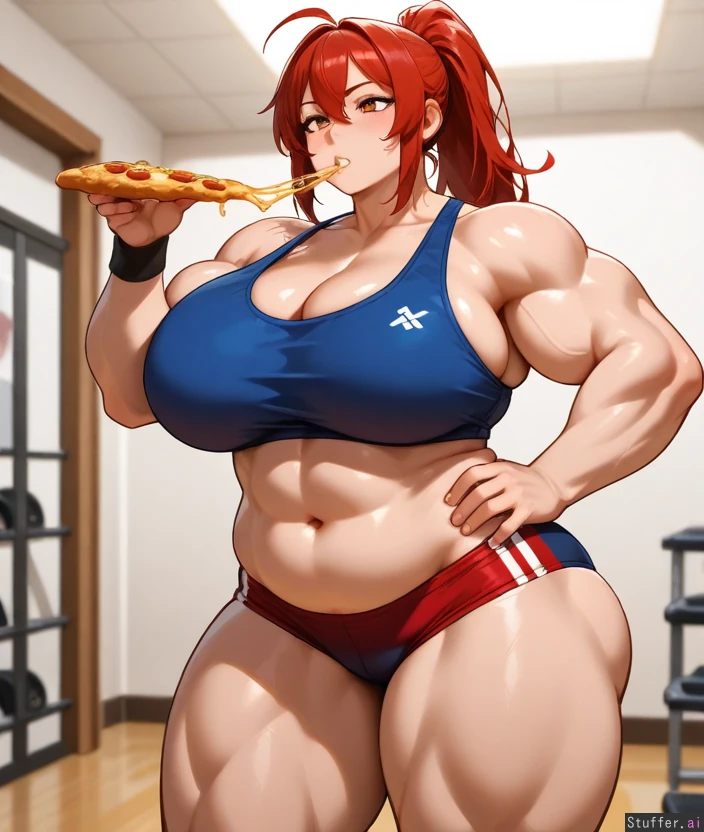 A muscular_female wearing gym clothes eating a lot of pizzas big big_belly