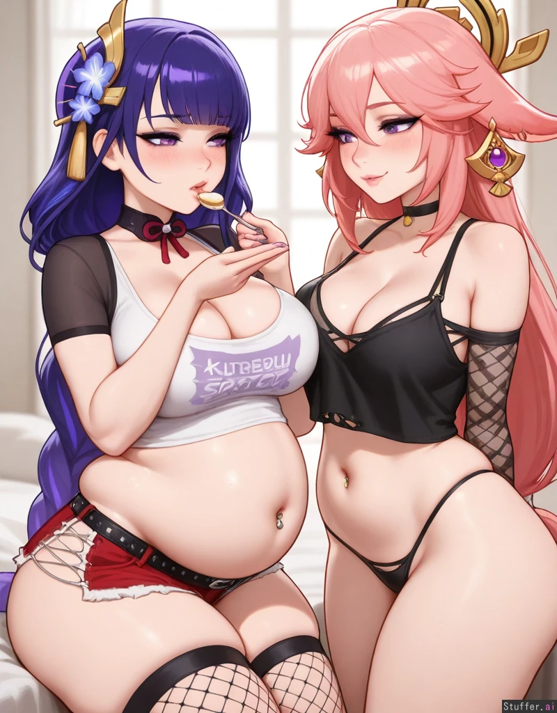 2girls, stunning beauty, gorgeous, ((eyeliner)), (blushing), choker, ((thicker thighs)), ((mature, adult)), (kittew(artist)), thong showing, (navel piercing), ((punk, cleavage)), blushyspicy(artist), couple, (yae_miko, feeding), (raiden_shogun, (large belly): 1.09)