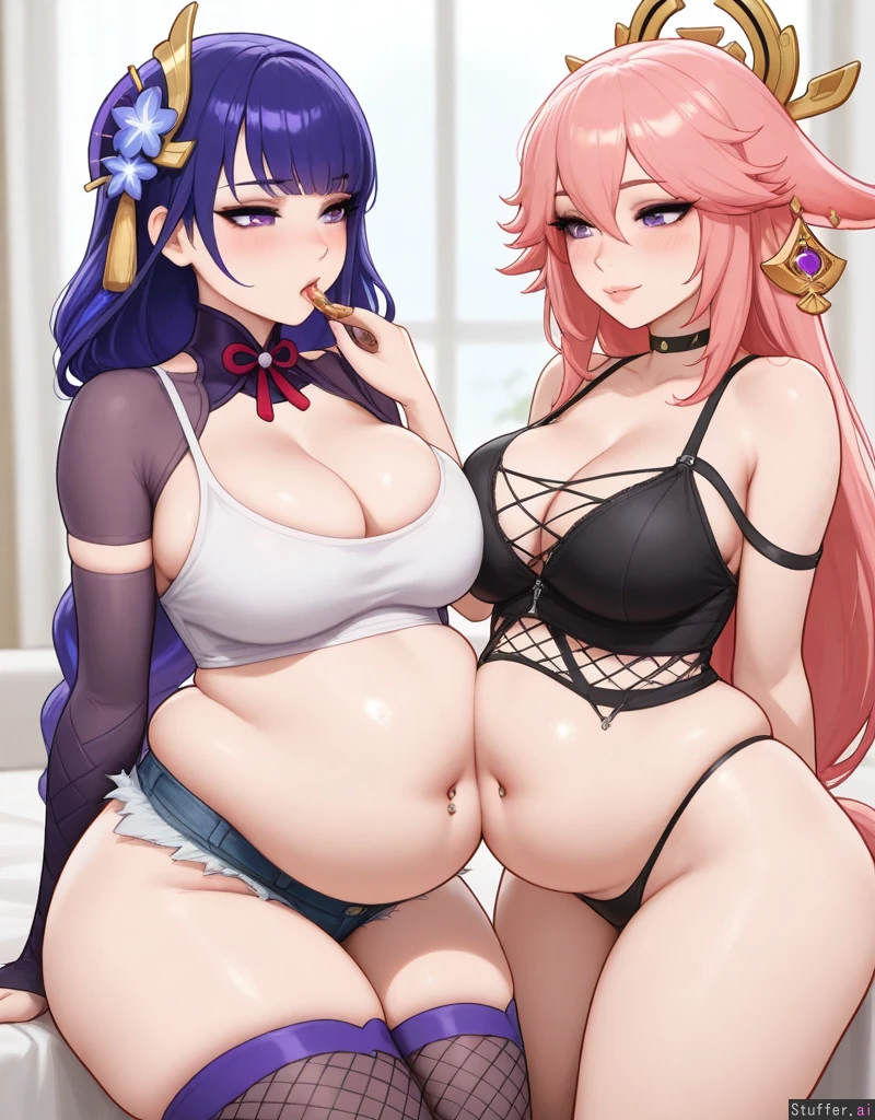 2girls, stunning beauty, gorgeous, ((eyeliner)), (blushing), choker, ((thicker thighs)), ((mature, adult)), (kittew(artist)), thong showing, (navel piercing), ((punk, cleavage)), blushyspicy(artist), couple, (yae_miko, feeding), (raiden_shogun, (large belly): 1.2)