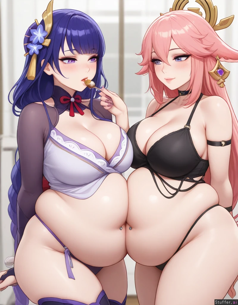 2girls, stunning beauty, gorgeous, ((eyeliner)), (blushing), choker, ((thicker thighs)), ((mature, adult)), (kittew(artist)), thong showing, (navel piercing), ((punk, cleavage)), blushyspicy(artist), couple, (yae_miko, feeding), (raiden_shogun, (large belly): 1.41)