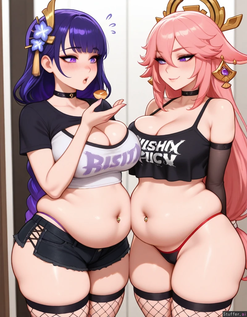2girls, stunning beauty, gorgeous, ((eyeliner)), (blushing), choker, ((thicker thighs)), ((mature, adult)), (kittew(artist)), thong showing, (navel piercing), ((punk, cleavage)), blushyspicy(artist), couple, (yae_miko, feeding), (raiden_shogun, (massive belly, overhanging gut, morbidly obese): 1)