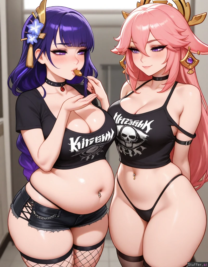 2girls, stunning beauty, gorgeous, ((eyeliner)), (blushing), choker, ((thicker thighs)), ((mature, adult)), (kittew(artist)), thong showing, (navel piercing), ((punk, cleavage)), blushyspicy(artist), couple, (yae_miko, feeding), (raiden_shogun, (massive belly, overhanging gut,inflated): 1)