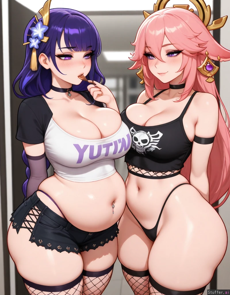 2girls, stunning beauty, gorgeous, ((eyeliner)), (blushing), choker, ((thicker thighs)), ((mature, adult)), (kittew(artist)), thong showing, (navel piercing), ((punk, cleavage)), blushyspicy(artist), couple, (yae_miko, feeding), (raiden_shogun, (colossal belly, overhanging gut,gigantic ass): 1)