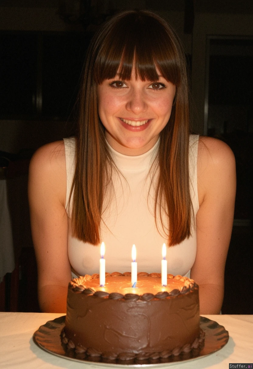 Birthday party, stunning 20 years old meaty brunette is happy, she has long hair with bangs, she is wearing a white sleeveless dress, dark room is lit only by candles on a small cake, front view, high resolution photo (Very obese milf with short hair and with huge cake:0.0)