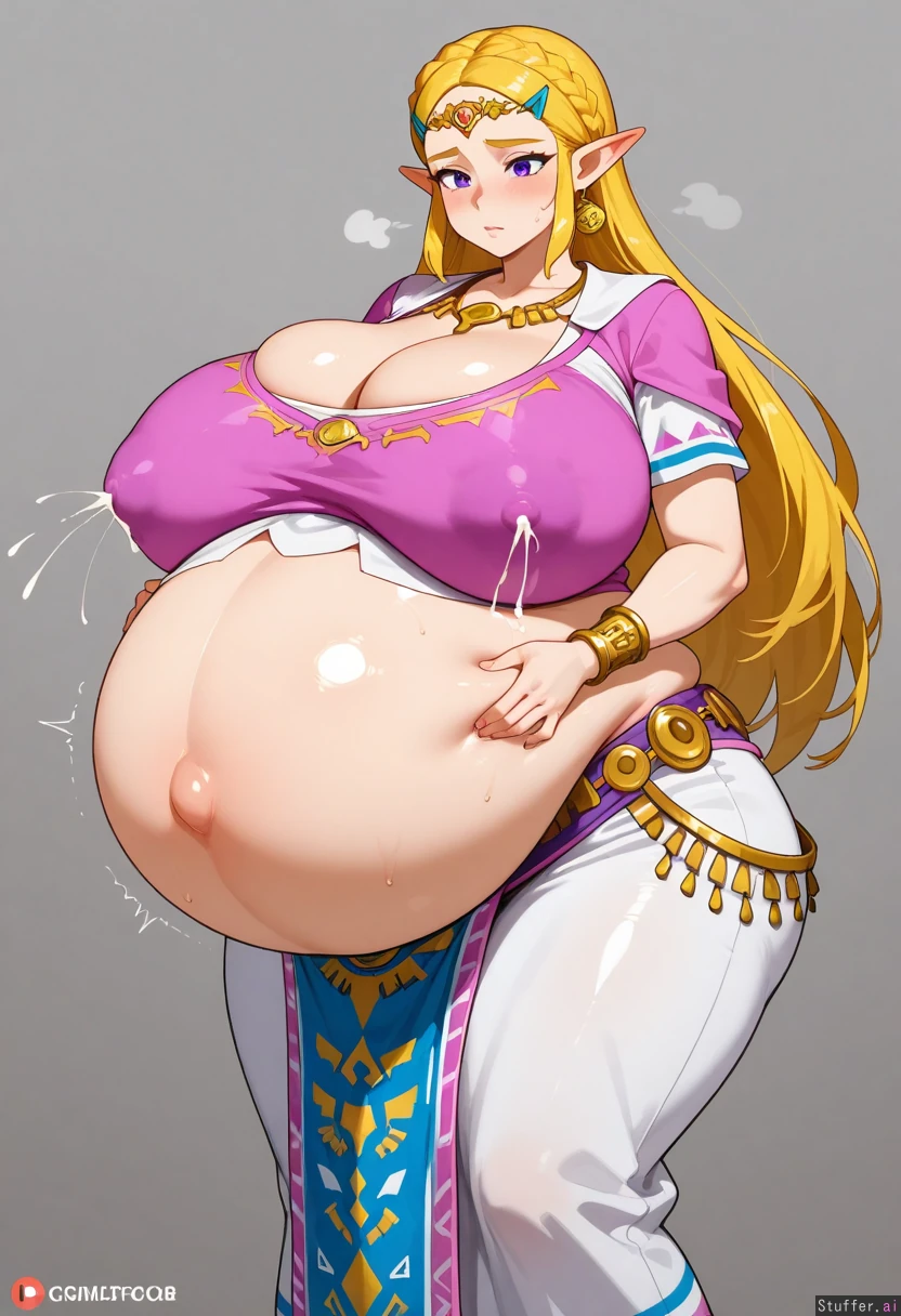 massively obese Zelda , huge belly, flabby belly, full breasts, cleavage, adult, tall, colossal belly, belly groping, pregnant belly, engorged breasts, lactation_through_clothes,