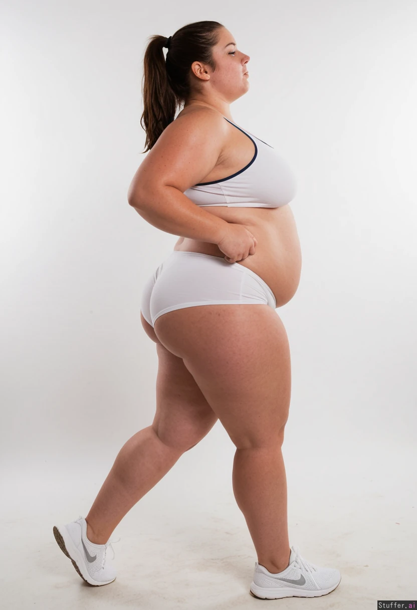 Running fit brunette, profile view, full body, white running panties and crop top, white running shoes, white background (Obese sweating heavily:1.3)