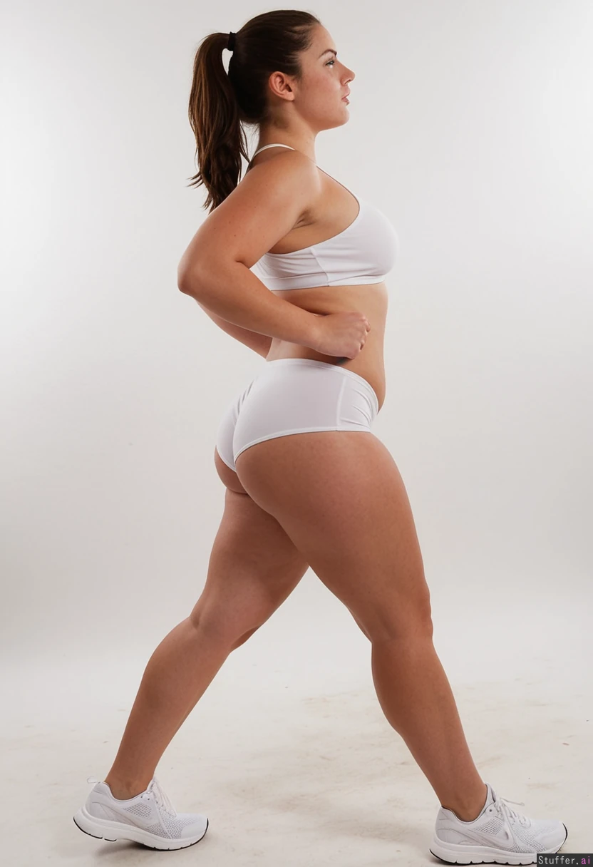 Running fit brunette, profile view, full body, white running panties and crop top, white running shoes, white background (Obese sweating heavily:0.85)