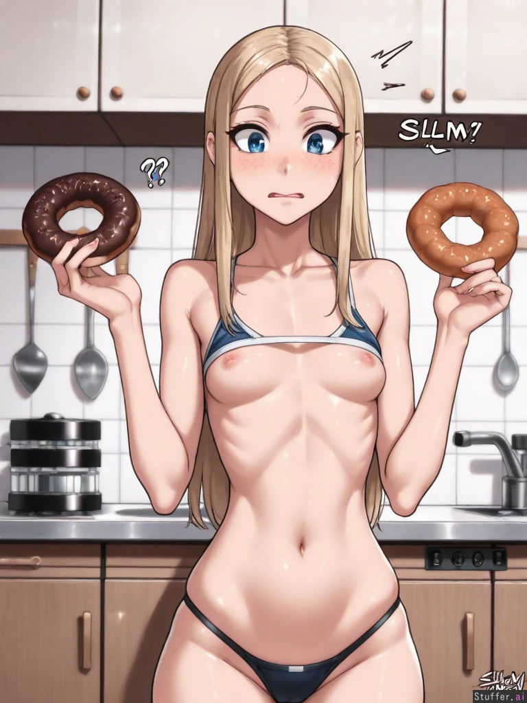 (nyantcha:1.2), (krekkov:1.4), (reiq:1.1), (kittew:1.2), 8k, high resolution, maximum pixel density, masterpiece, (((highly detailed))), ((flawless)), (((high rating))), ((highly detailed face)), full resolution, 8k, high resolution, best quality, detailed eyes, Appearance: Long straight blonde hair with light blue stripes, beautiful wide expressive big sparkling blue eyes, starry pupils, tan skin, freckles, blushing heavily, mischievous eyes, horny, anime-woman, shocked expression, embarrassed, (erect nipples), tall, wide hips Outfit: tight red crop top, black thong, Location: Standing, in kitchen, donut in hand, side-view, looking down at self, lounging, Modifiers: (Slim body:1.8), (enormous heavy breasts:0.8), (morbidly obese ssbbw:1.0),