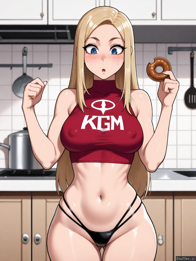 (nyantcha:1.2), (krekkov:1.4), (reiq:1.1), (kittew:1.2), 8k, high resolution, maximum pixel density, masterpiece, (((highly detailed))), ((flawless)), (((high rating))), ((highly detailed face)), full resolution, 8k, high resolution, best quality, detailed eyes, Appearance: Long straight blonde hair with light blue stripes, beautiful wide expressive big sparkling blue eyes, starry pupils, tan skin, freckles, blushing heavily, mischievous eyes, horny, anime-woman, shocked expression, embarrassed, (erect nipples), tall, wide hips Outfit: red crop top, black thong, Location: Standing, in kitchen, donut in hand, side-view, looking down at self, Modifiers: (Slim body:1.8), (enormous heavy breasts:0.8), (morbidly obese ssbbw:1.0),