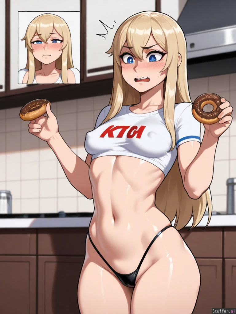 (nyantcha:1.2), (krekkov:1.4), (reiq:1.1), (kittew:1.2), 8k, high resolution, maximum pixel density, masterpiece, (((highly detailed))), ((flawless)), (((high rating))), ((highly detailed face)), full resolution, 8k, high resolution, best quality, detailed eyes, Appearance: Long straight blonde hair with light blue stripes, beautiful wide expressive big sparkling blue eyes, starry pupils, tan skin, freckles, blushing heavily, mischievous eyes, horny, anime-woman, shocked expression, embarrassed, (erect nipples), tall, wide hips Outfit: red crop top, black thong, Location: Standing, in kitchen, donut in hand, side-view, looking down at self, Modifiers: (Slim body:1.8), (enormous heavy breasts:0.7), (morbidly obese ssbbw:1.0),