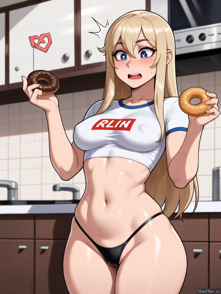 (nyantcha:1.2), (krekkov:1.4), (reiq:1.1), (kittew:1.2), 8k, high resolution, maximum pixel density, masterpiece, (((highly detailed))), ((flawless)), (((high rating))), ((highly detailed face)), full resolution, 8k, high resolution, best quality, detailed eyes, Appearance: Long straight blonde hair with light blue stripes, beautiful wide expressive big sparkling blue eyes, starry pupils, tan skin, freckles, blushing heavily, mischievous eyes, horny, anime-woman, shocked expression, embarrassed, (erect nipples), tall, wide hips Outfit: red crop top, black thong, Location: Standing, in kitchen, donut in hand, side-view, looking down at self, Modifiers: (Slim body:1.7), (enormous heavy breasts:0.8), (morbidly obese ssbbw:1.0),