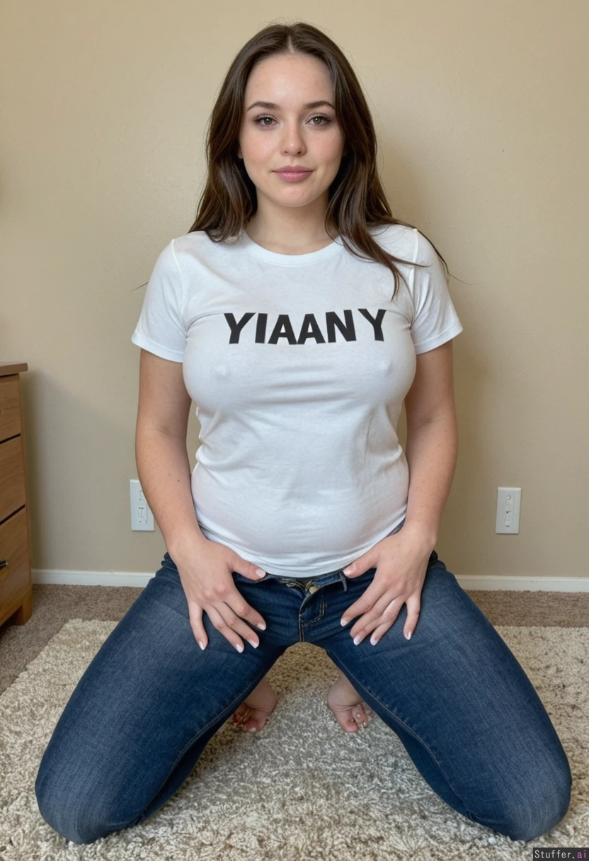 full body women wearing jeans with pockets kneeling three quarter view wearing tshirt slightly chubby (big legs) legs together