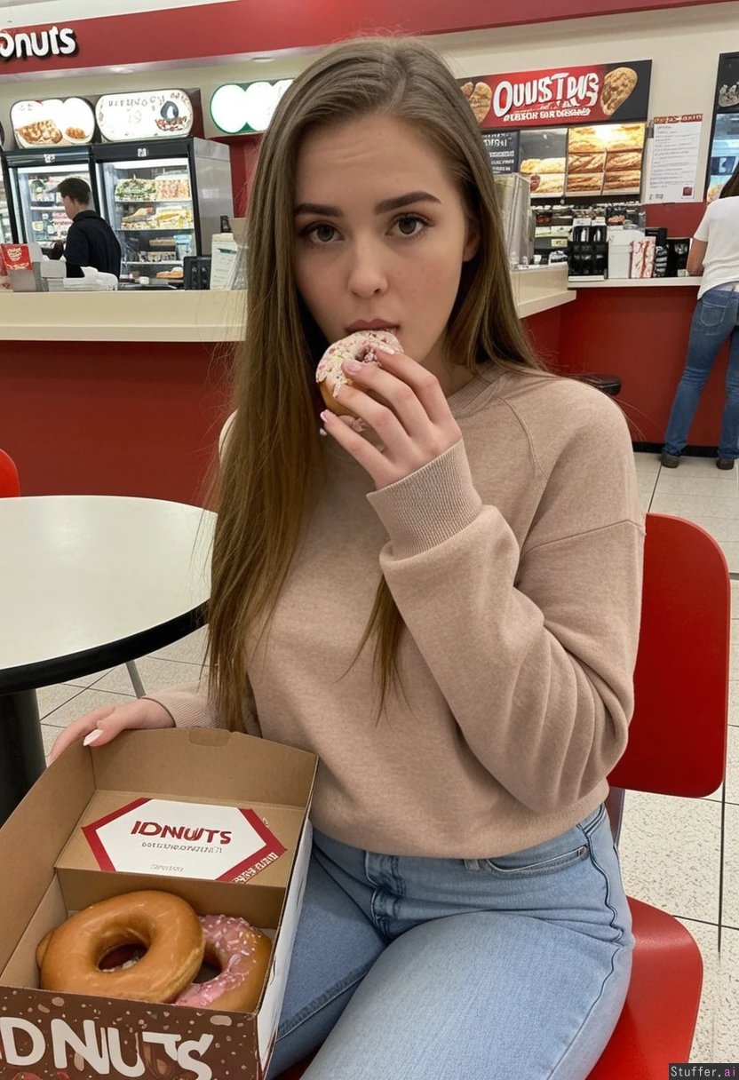 21 year old woman with long brown golden hair in tight long pullover and light blue jeans slim figure Sitting at a table in the food court, eating a box of donuts soft love handles (Big Fat pudgy belly: 0.55) front view