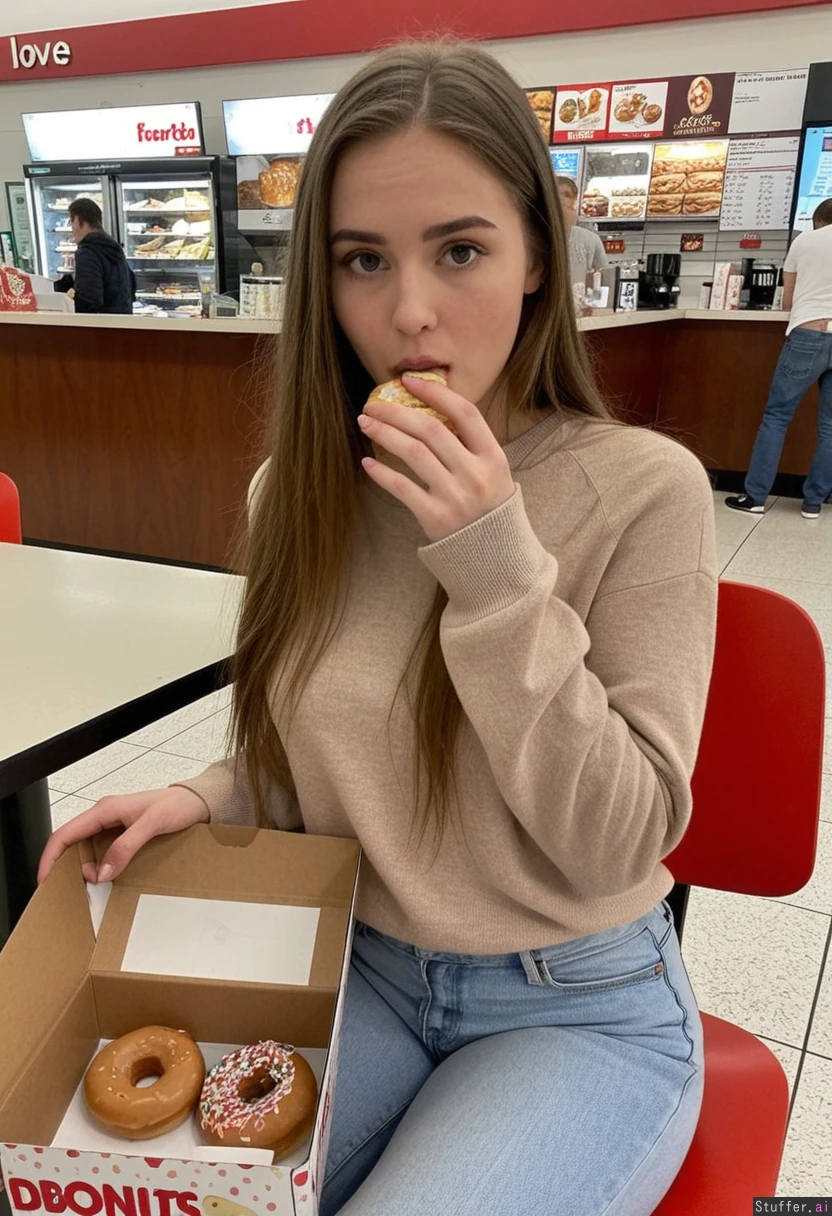 21 year old woman with long brown golden hair in tight long pullover and light blue jeans
