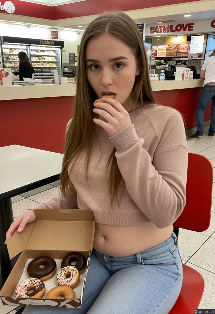 Sitting at a table in the food court, eating a box of donuts