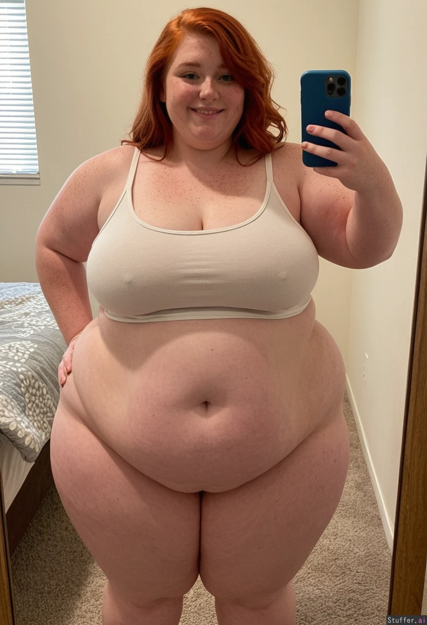 redhead, cute perfect face, shy smile, freckles, at home, and white tank top, selfie, full body view, facing camera Chubby, average tits, pointy nipples, (big wide hips:1.5) ((extremely thicc thighs))