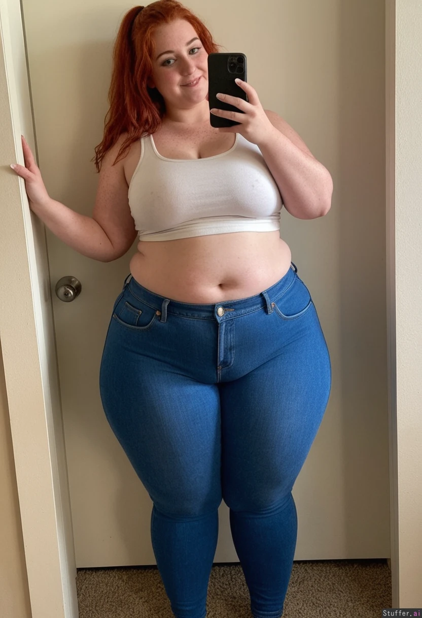 redhead, cute perfect face, shy smile, freckles, at home, and white tank top, jeans, selfie, full body view, facing camera, average tits, pointy nipples, (big wide hips:1.7) ((extremely thicc thighs))