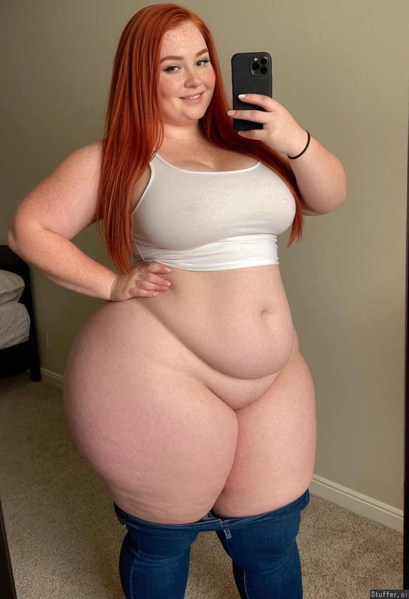 redhead, cute perfect face, shy smile, freckles, at home, and white tank top, jeans, selfie, full body view, facing camera, dd tits, pointy nipples, (big wide hips:1.7) ((extremely thicc thighs))