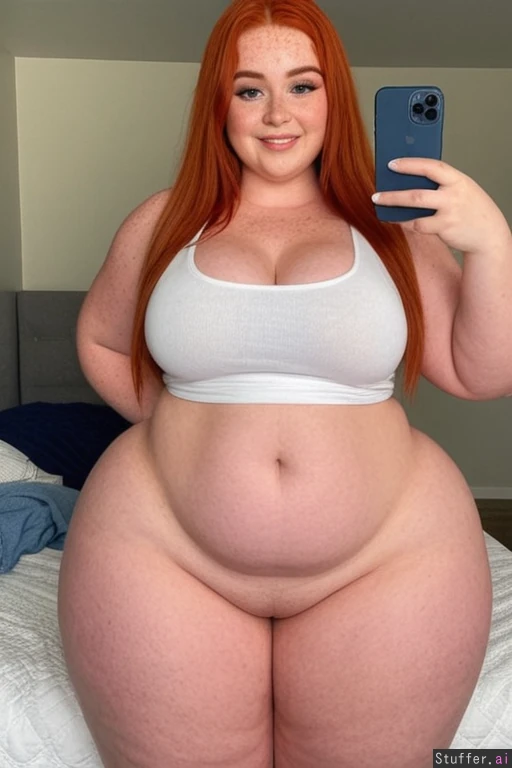 redhead, cute perfect face, shy smile, freckles, at home, and white tank top, jeans, selfie, full body view, facing camera, dd tits, pointy nipples, (big wide hips:1.7) ((extremely thicc thighs))