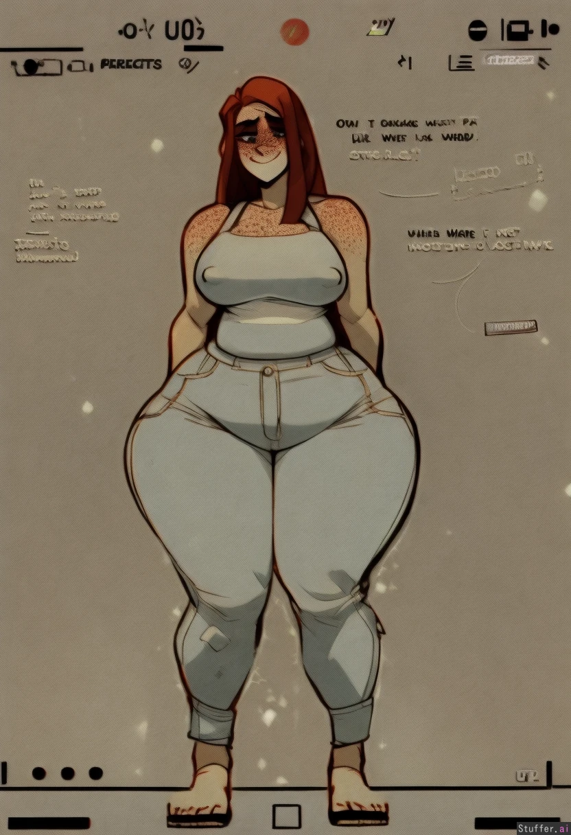 best quality, high rating, redhead, cute perfect face, shy smile, freckles, chubby, at home, and white tank top, jeans, full body view, facing camera, dd tits, pointy nipples, (big wide hips:1.7) ((extremely thicc thighs))