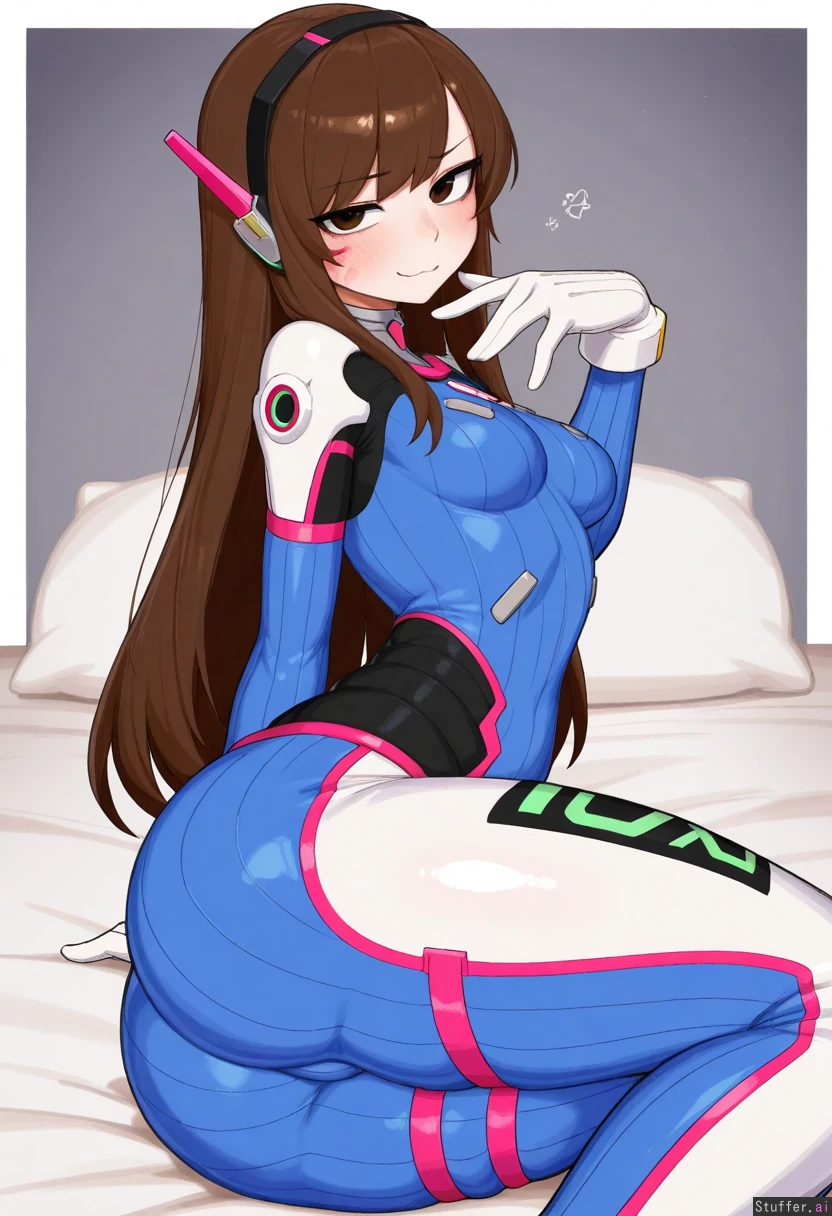 absurdres, 8k, perfect anatomy, masterpiece, beautiful face, beautiful eyes, RockSolidArt. /(artist/), RockSolidArt(artist/) ,8), cute, 1girl, solo, (tall female:1.3),(D.Va from Overwatch), brown hair, brown eyes, straight long hair, jumpsuit, skintight jumpsuit, skintight, smug, blush, looking at viewer, arched_back, sexy, sexy_pose , perspective , stretched_clothing, (merunyaa, (usa37107692:1.2), (ohasi_art), betterwithsalt), (big ass:1.4), small breasts, (fat thighs), (thigh overflow), (bursting thighs), (huge inner thighs), (wide hips:), (front angle:1.3), legs_together , (small waist), hyper thighs, sitting on bed,