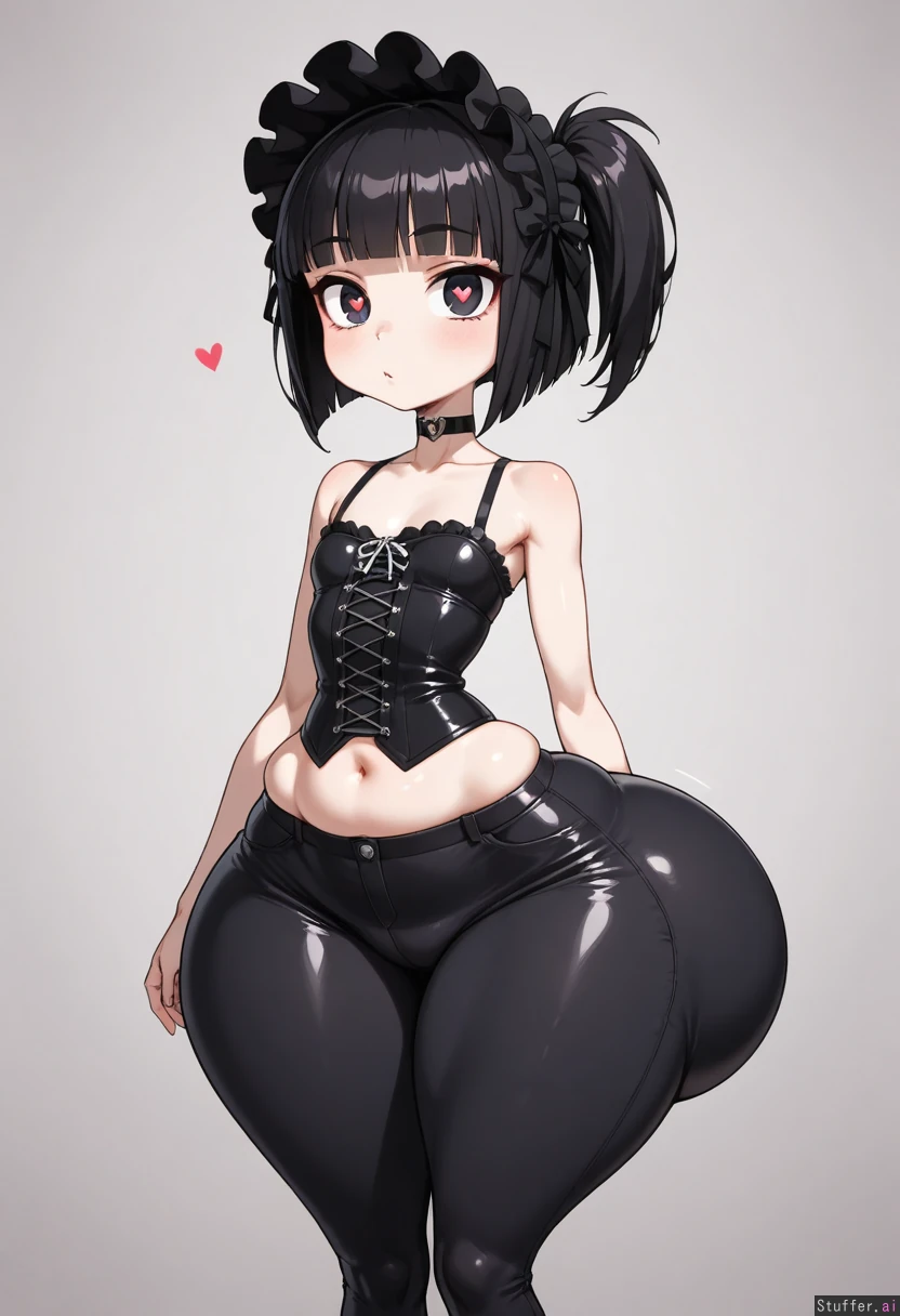 confident, horny, maiden ssbbw, heart-shaped_pupils, solo, 1girl, ((goth, punk, gothic, goth_girl, gothic_lolita, corset)), ((tiny shoulders, chubby belly, belly overhang, (((tiny waist, wide hips, enormous ass))), ((((bottomheavy:1.4)), skinny girl)), (pearshaped shortstack), weight gain)), ((short torso)), Standing in a Bakery, feedee idol maiden, (((Front view)))
