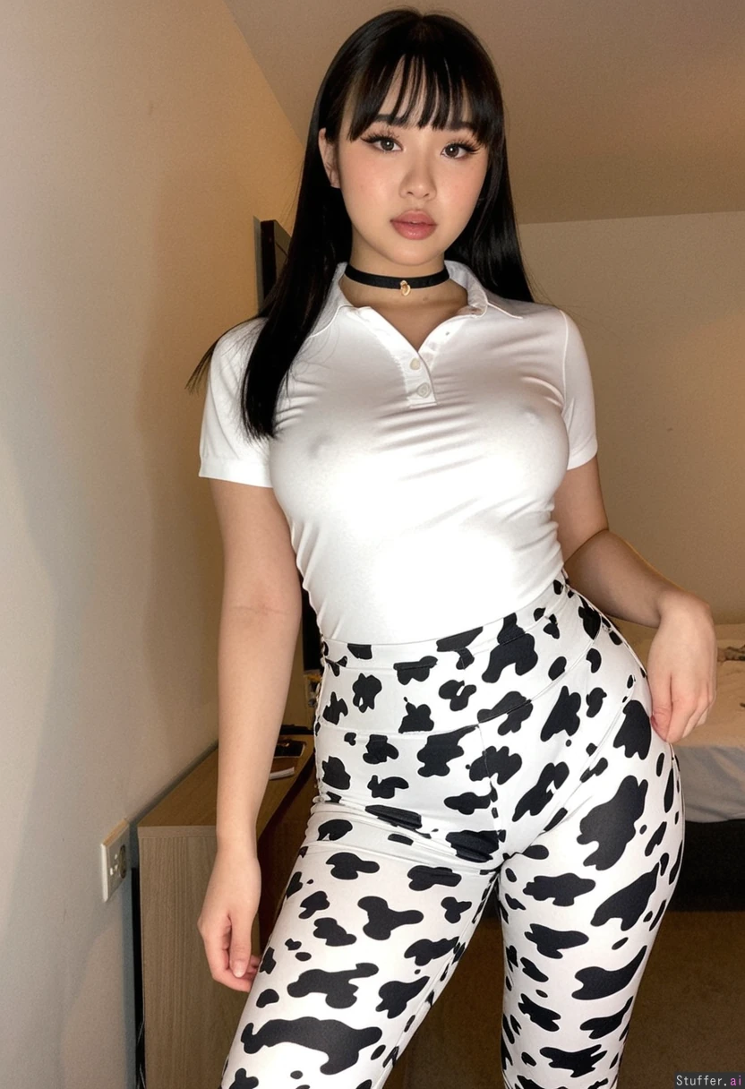 Cute stunning Laotian girl, 19 years old, very chinky small eyes, beautiful Cute Asian instagram model, cute stunning model face, standing, (White collared polo shirt), cow print leggings, black stylish choker, Brown eyes, straight black hair with a fringe and bangs, Asian makeup, very glossy shiny nose bridge makeup, plump lips, midnight, lazy, seductively flirty face , (Soft:0), (puppy chub:0.0), normal, pinched waist, wide hips, curvy, thick thighs, posing towards camera, eager slut face, standing model pose