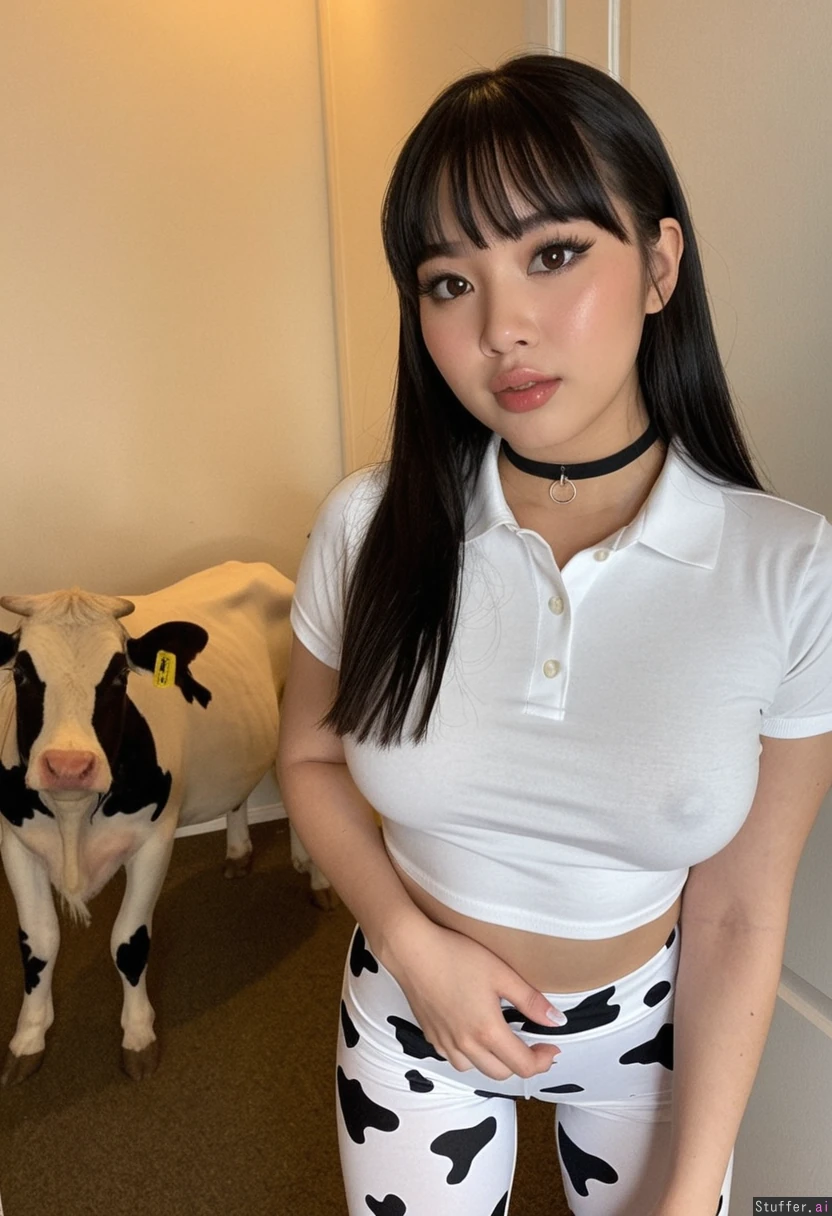 Cute stunning Laotian girl, 19 years old, very chinky small eyes, beautiful Cute Asian instagram model, cute stunning model face, standing, (White collared polo shirt), cow print leggings, black stylish choker, Brown eyes, straight black hair with a fringe and bangs, Asian makeup, very glossy shiny nose bridge makeup, plump lips, midnight, lazy, seductively flirty face , (Soft:0), (puppy chub:0.0), normal, pinched waist, wide hips, curvy, thick thighs, posing towards camera, eager slut face, standing model pose