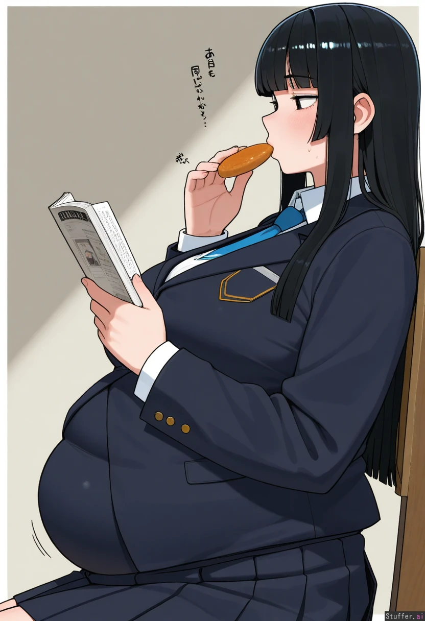 Ohasi_art /(Artist/), 1 Girl, Asian, black hair, Hime cut Hair, Academy Uniform, Pleated Skirt, Blue Tie, Black Blazer, Covered Belly, Fat Belly, (Chubby, Fat Rolls:1.1), Double Chin, White Background, From Side, Eating, Reading Book, Studious,