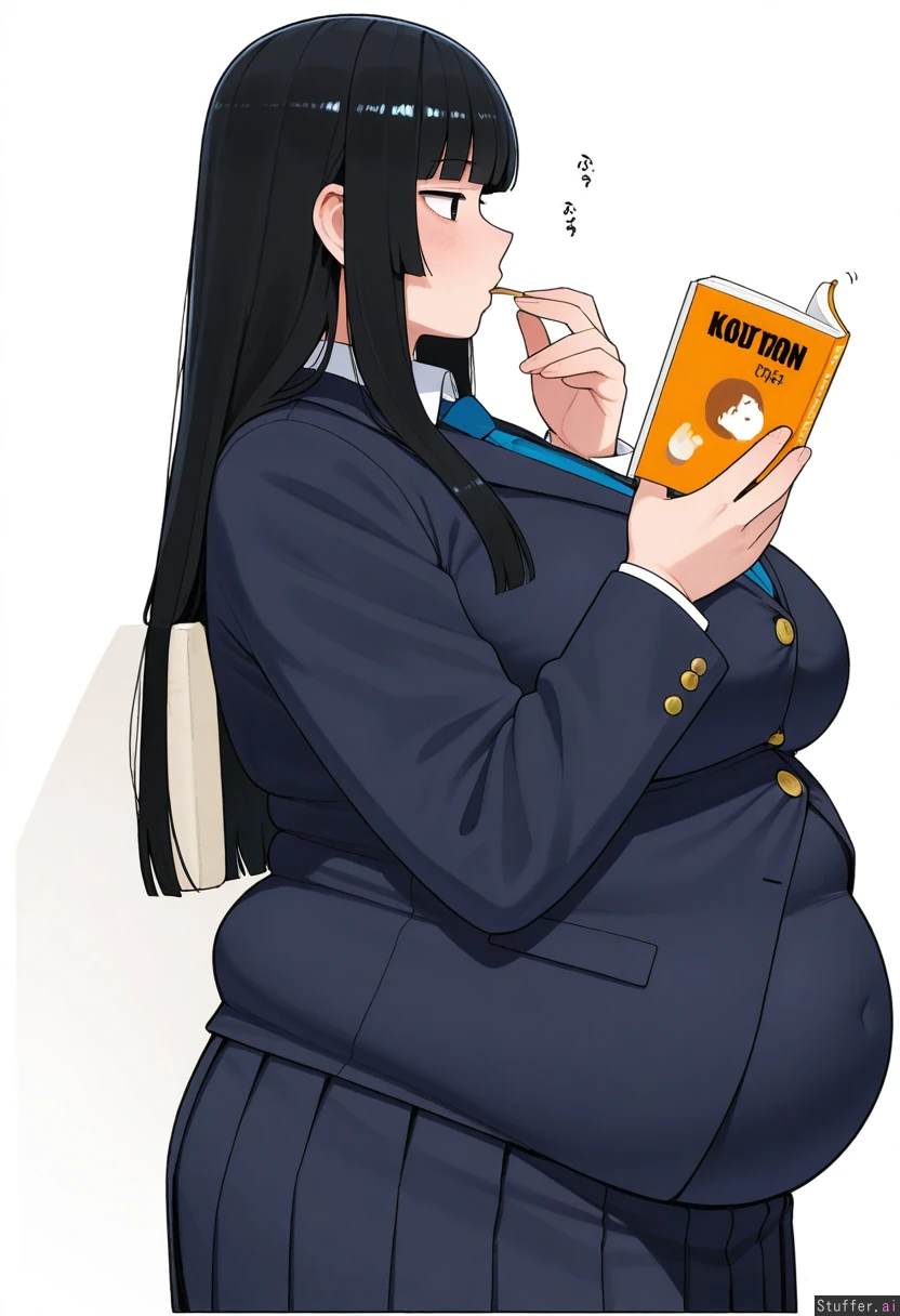 Ohasi_art /(Artist/), 1 Girl, Asian, black hair, Hime cut Hair, Academy Uniform, Pleated Skirt, Blue Tie, Black Blazer, Covered Belly, Fat Belly, (Chubby, Fat Rolls:1.1), Double Chin, White Background, From Side, Eating, Reading Book, Studious,