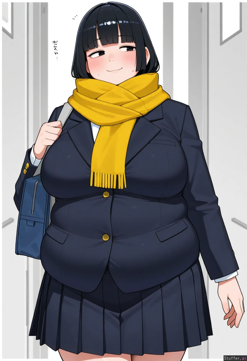 Ohasi_art /(Artist/), 1 Girl, Asian, black hair, Hime cut Hair, Academy Uniform, Pleated Skirt, Blue Tie, Black Blazer, Tight Clothes, Scarf, Large Belly, (Obese, Fat Rolls:1.0), (Fat Cheeks, Double Chin:1.1), White Background, Flirty Smile, Walking, Book Bag,