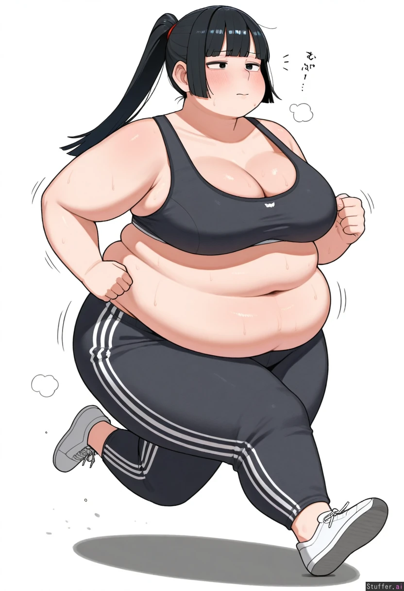 Ohasi_art /(Artist/), 1 Girl, Asian, black hair, Hime cut Hair, Sports Bra, Sweat Pants, Hair Ponytail, Large Belly, (Obese, Fat Rolls:1.1), (Fat Cheeks, Double Chin:1.1), White Background, Sweaty, Struggling, Panting, Jogging,