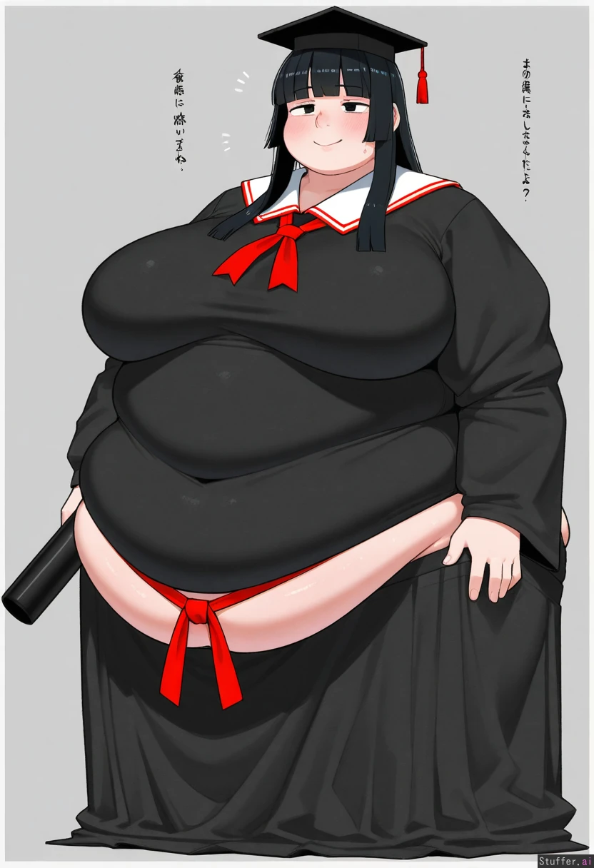 Ohasi_art /(Artist/), 1 Girl, Asian, black hair, Hime cut Hair, Graduation Gown, Graduation Cap, Tight Clothes, Large Belly, (Obese, Fat Rolls:1.2), (Fat Cheeks, Double Chin:1.1), White Background, Fullbody, Standing, Bright Smile,