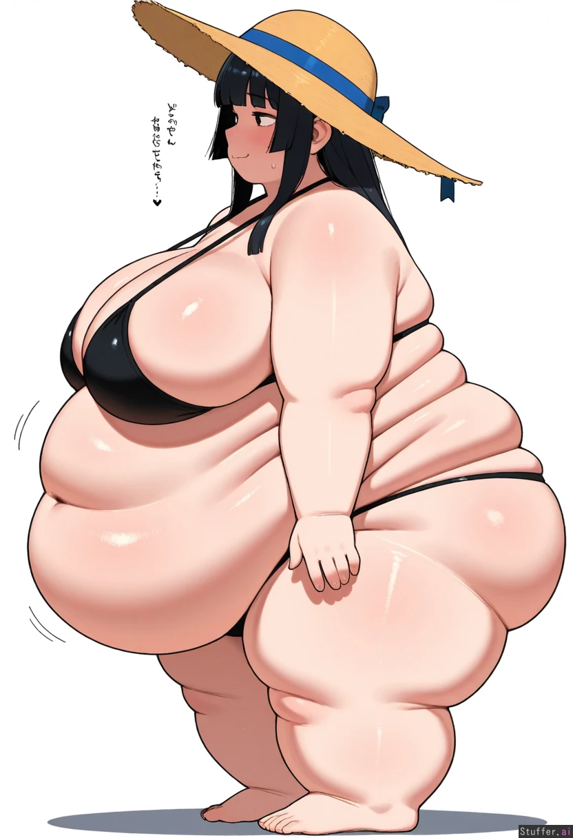 Ohasi_art /(Artist/), 1 Girl, Asian, black hair, Hime cut Hair, Black Bikini, Sun Hat, (Large Belly, Bloated Belly:1.1), (Obese, Fat Rolls:1.25), (Fat Cheeks, Double Chin:1.1), White Background, Fullbody, Soft Smile, From Side,