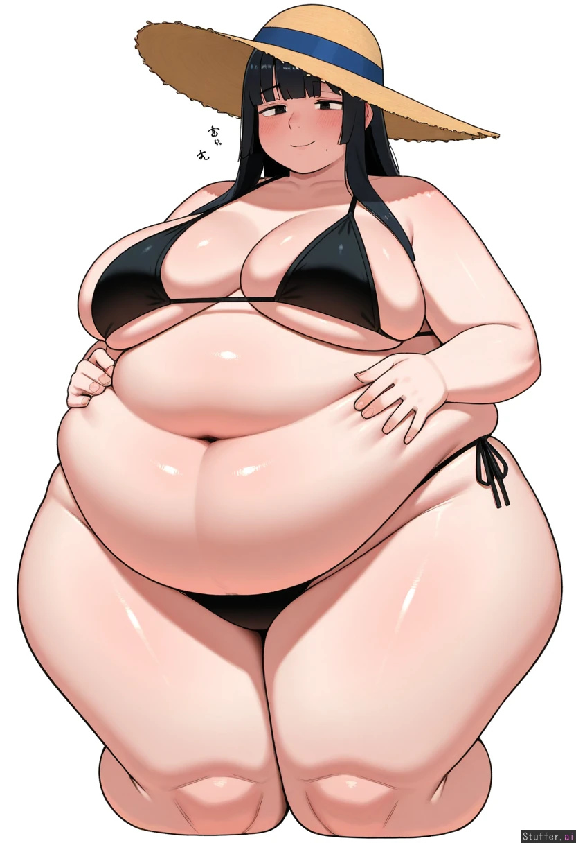 Ohasi_art /(Artist/), 1 Girl, Asian, black hair, Hime cut Hair, Black Bikini, Sun Hat, (Large Belly, Bloated Belly:1.1), (Obese, Fat Rolls:1.25), (Fat Cheeks, Double Chin:1.1), White Background, Fullbody, Soft Smile,