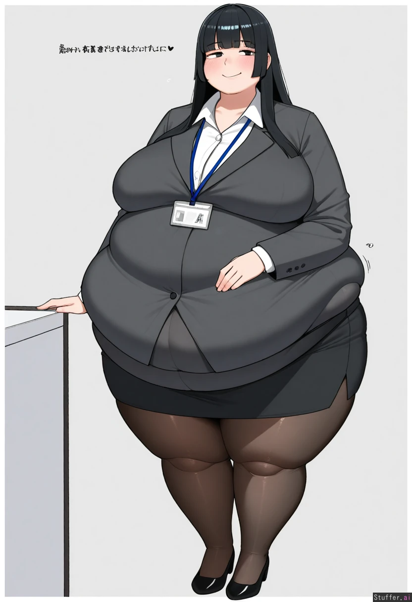 Ohasi_art /(Artist/), 1 Girl, Asian, black hair, Hime cut Hair, Office Lady, Pencil Skirt, Tights, Covered Belly, (Large Belly, Bloated Belly:1.0), (Obese, Fat Rolls:1.3), (Fat Cheeks, Double Chin:1.2), White Background, Flirty Smile, Fullbody,