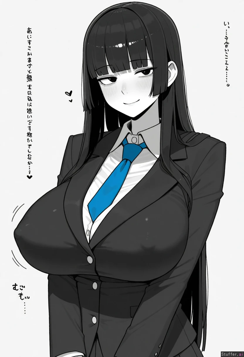 Ohasi_art /(Artist/), Greyscale 1 Girl, Asian, black hair, Hime cut Hair, Academy Uniform, Blue Tie, Black Blazer, Slim, Huge Breasts, White Background, Flirty Smile, Nipple Outline,