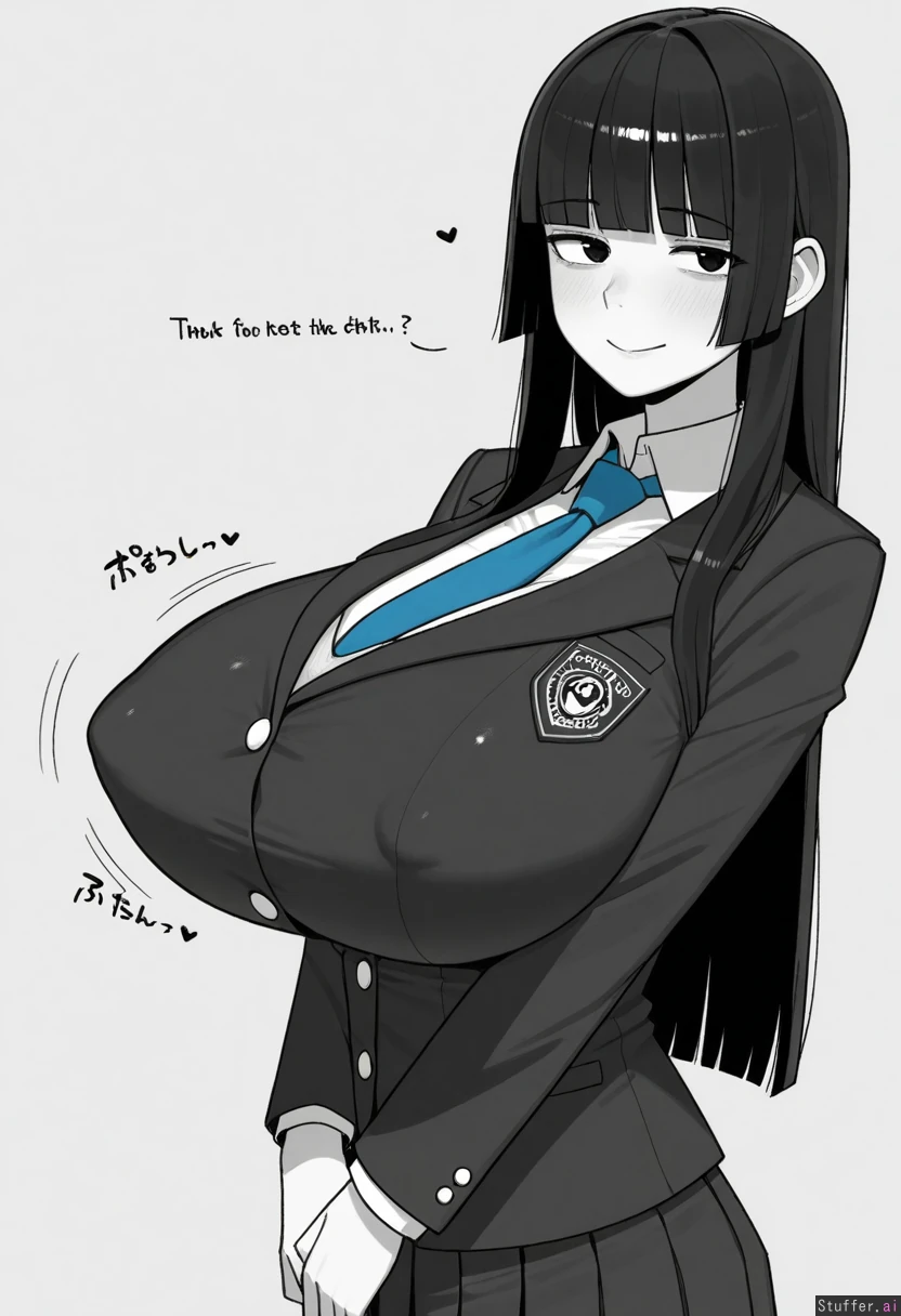 Ohasi_art /(Artist/), Greyscale 1 Girl, Asian, black hair, Hime cut Hair, Academy Uniform, Blue Tie, Black Blazer, Slim, Huge Breasts, White Background, Flirty Smile, Nipple Outline,