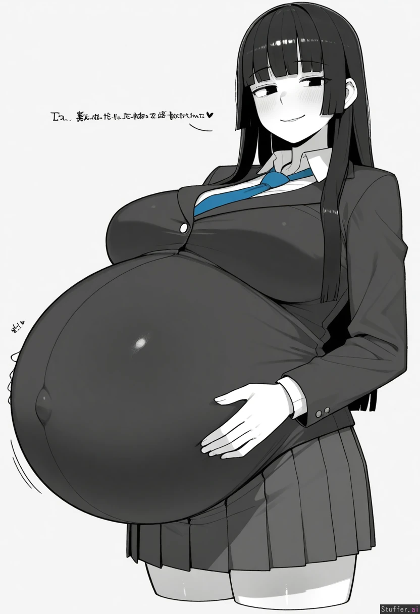 Ohasi_art /(Artist/), Greyscale 1 Girl, Asian, black hair, Hime cut Hair, Academy Uniform, Blue Tie, Black Blazer, Pleated Skirt, Pregnant Belly, Huge Belly, White Background, Flirty Smile,