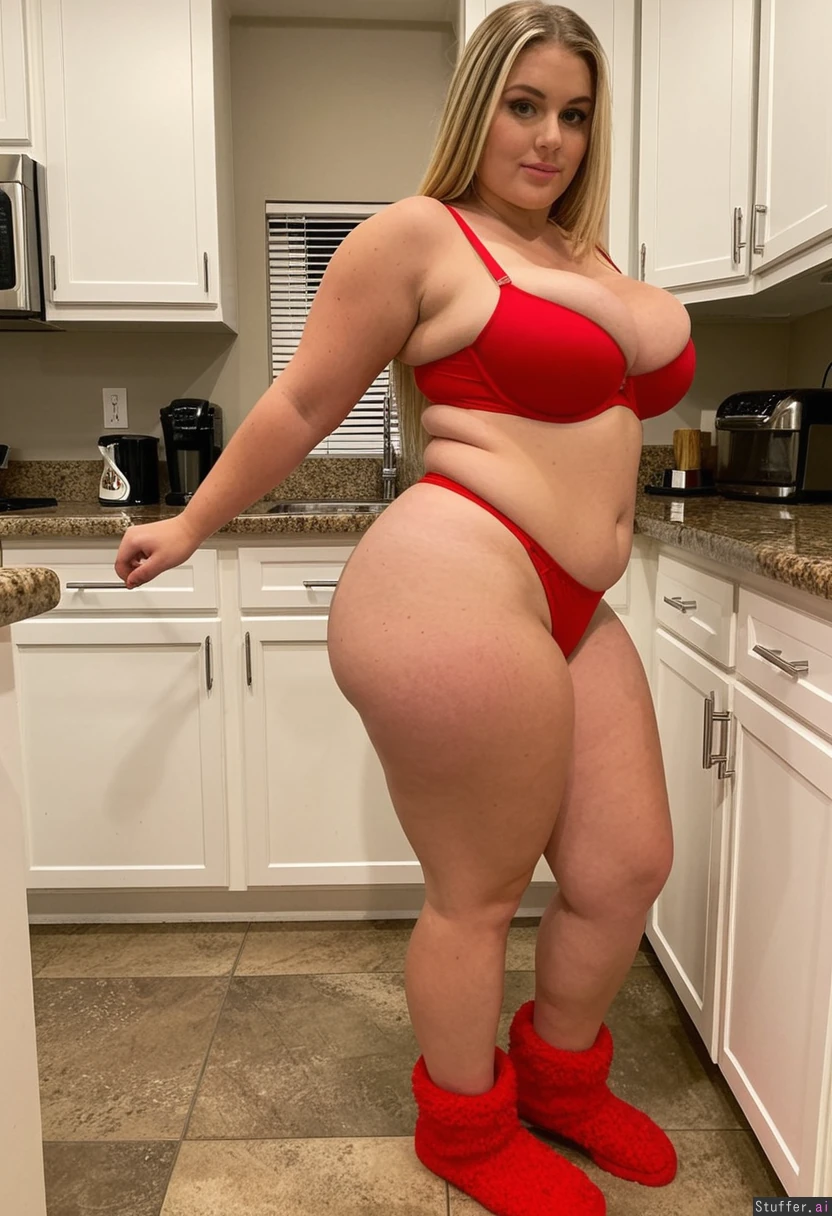 (white pawg, (dark golden brown tanned skin), beautiful face Chubby cheeks detailed green eyes beautiful blonde hair attractive breathtakingly beautiful ((Tight fitting red bra, tight fitting red thong)) amazing cleavage chubby thighs (body getting softer: 1.1) Wearing Fuzzy red slippers Standing in kitchen