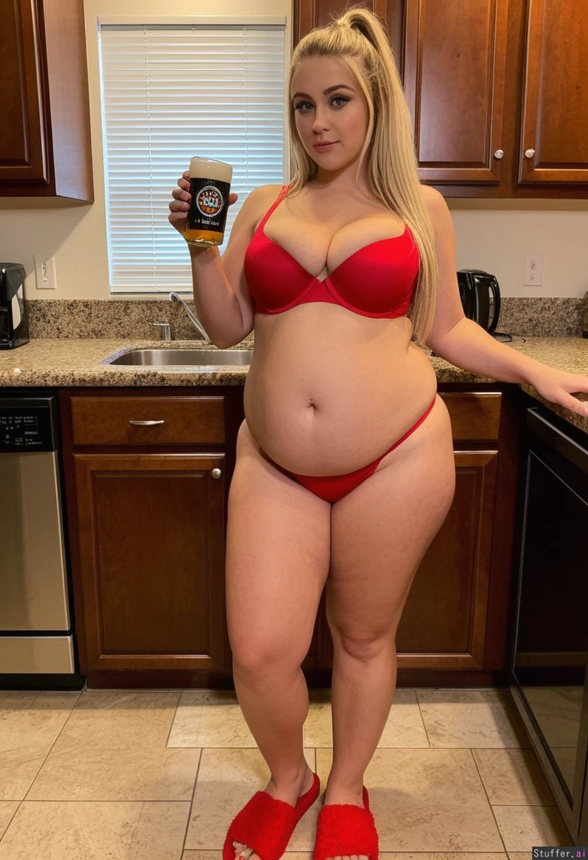 Beautiful blonde 22years old Pawg Big green eyes Gorgeous face Heavy perfect make up Dark Tan bronze skin Long perfect hair blow out Tight red bra Tight red thong White fuzzy slippers Amazing cleavage Thick thighs (Fatting beer belly: 1.3) Very realistic Standing in kitchen