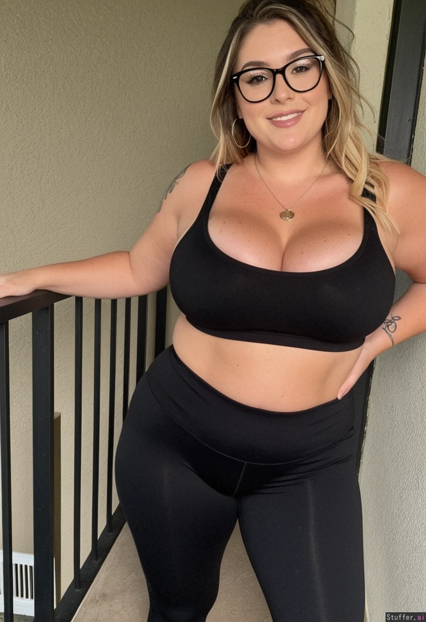 white woman, brown eyes, freckles, long messy dark brown , blonde highlights in very front part of hair, sharp nose, high cheekbones, seductive smile, eye-shadow, lipstick, blush, necklace, earrings, Big lips Extremely beautiful face Dark bronze tan Pawg Chubby thighs Pointy chin Huge Wide hypes Tattoos all over arms Black glasses Slight lower belly fat Amazing cleavage (black crop top), (((black leggings))) (full_body_view) on balcony (Extreme Weight gain: 1.3)