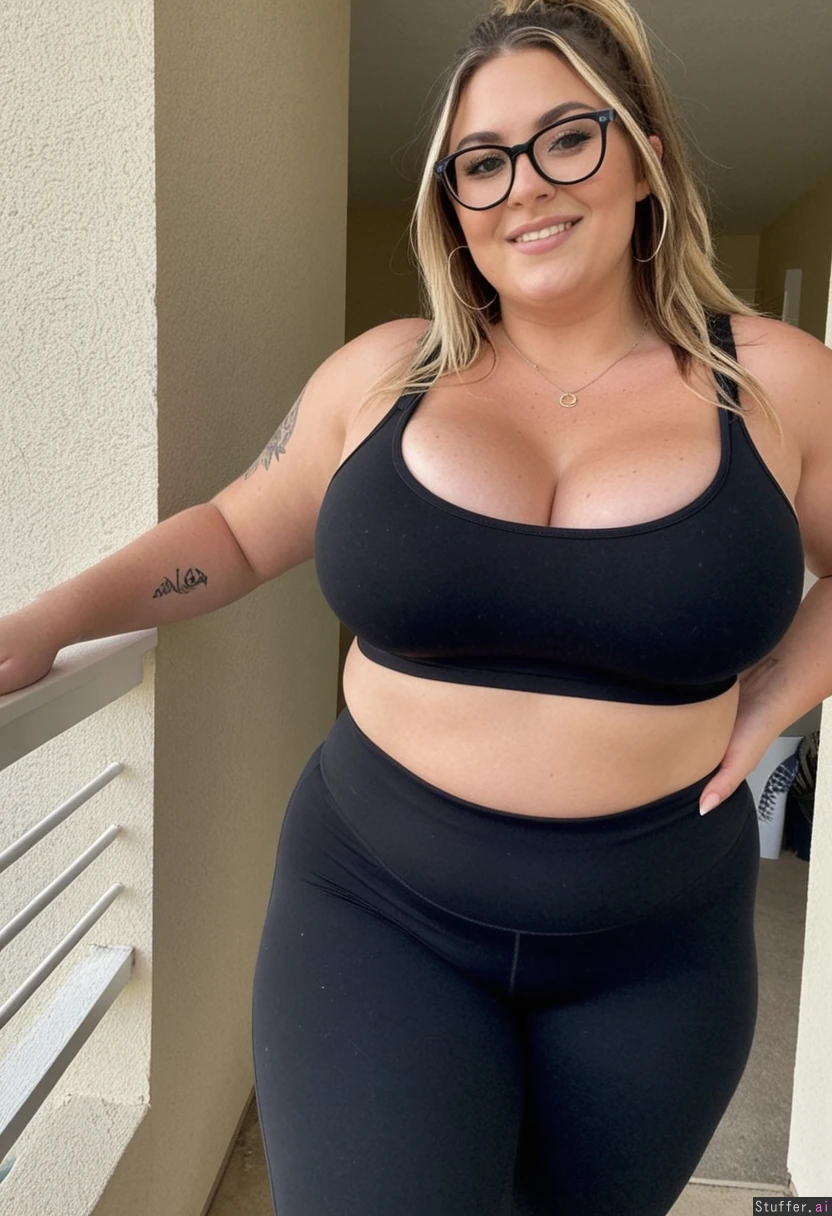 white woman, brown eyes, freckles, long messy dark brown , blonde highlights in very front part of hair, sharp nose, high cheekbones, seductive smile, eye-shadow, lipstick, blush, necklace, earrings, Big lips Extremely beautiful face Dark bronze tan Pawg Huge Chubby thighs Pointy chin Huge Wide hypes Tattoos all over arms Black glasses Slight lower belly fat Amazing cleavage (black crop top), (((black leggings))) (full_body_view) on balcony (Extreme Weight gain: 1.5)