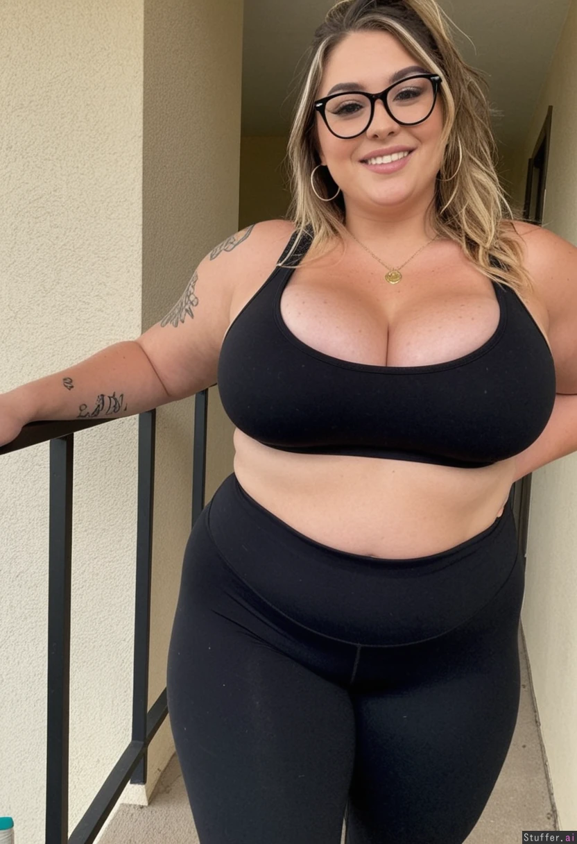 white woman, brown eyes, freckles, long messy dark brown , blonde highlights in very front part of hair, sharp nose, high cheekbones, seductive smile, eye-shadow, lipstick, blush, necklace, earrings, Big lips Extremely beautiful face Dark bronze tan Pawg Huge Chubby thighs Pointy chin Huge Wide hypes Tattoos all over arms Black glasses Fat lower belly Amazing cleavage (black crop top), (((black leggings))) (full_body_view) on balcony (Extreme Weight gain: 1.4)