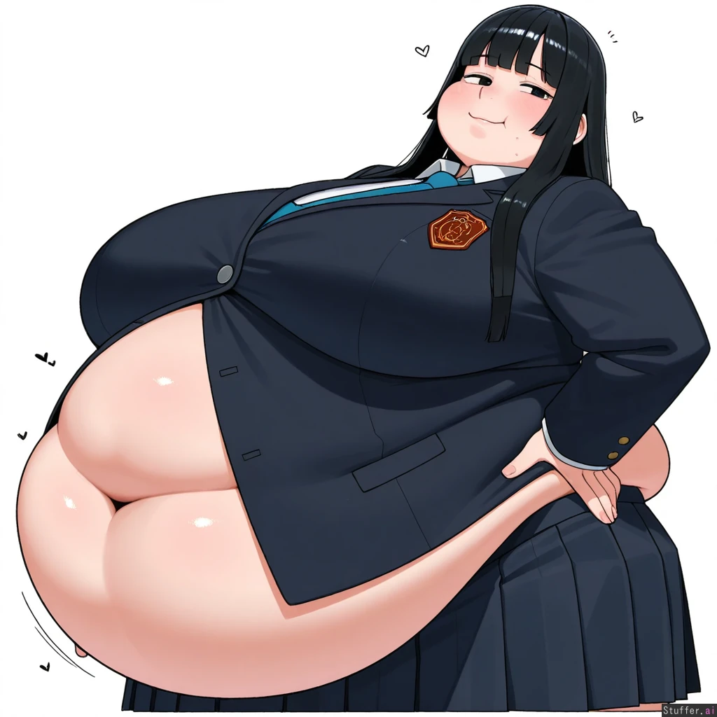 Ohasi_art /(Artist/), 1 Girl, Asian, black hair, Hime cut Hair, Academy Uniform, Pleated Skirt, Blue Tie, Black Blazer, (Huge Belly, Bloated Belly:1.1), (Obese, Fat Rolls:1.2), (Double Chin, Fat Cheeks:1.2), White Background, Flirty Smile,