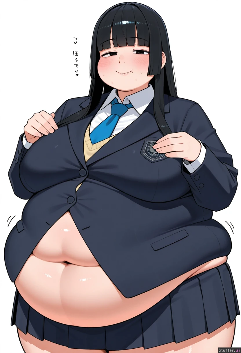 Ohasi_art /(Artist/), 1 Girl, Asian, black hair, Hime cut Hair, Academy Uniform, Pleated Skirt, Blue Tie, Black Blazer, Covered Belly, (Huge Belly, Bloated Belly:1.1), (Obese, Fat Rolls:1.2), (Double Chin, Fat Cheeks:1.2), White Background, Flirty Smile,